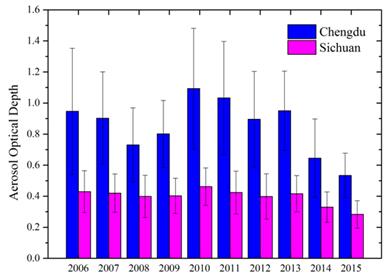四川盆地由于特殊的地形影响,平均风速较小,出现静风的频率高,加之成都市经济较发达,区域内工业排放的污染物量大,使得气溶胶浓度居高不下,雾-霾天气出现频率较高。刘馨语利用CARSNET(中国气溶胶光学特性监测网)提供的地基AOD(气溶胶光学厚度)观测资料,结合订正后的MODIS(中分辨率成像光谱仪)卫星AOD数据(3km×3km分辨率)进行时空匹配,对比验证MODIS数据的可靠性,再进一步分析四川地区2006-2015年近10年来AOD的时空分布及趋势变化特征。