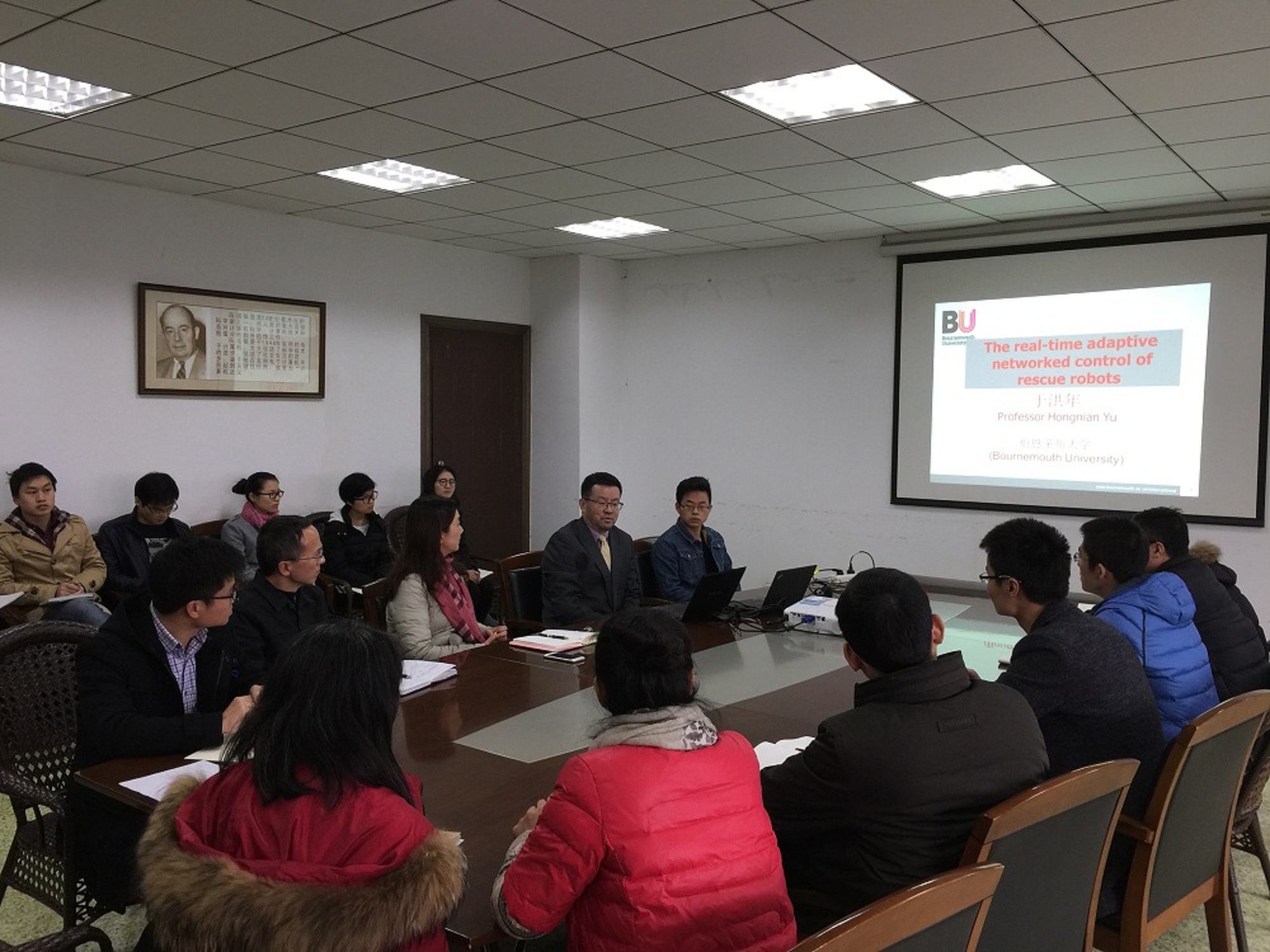 【本网讯】12月13日下午,英国伯恩茅斯大学(Bournemouth University)于洪年教授(Professor Yu Hongnian)应邀在我校航空港校区信息楼第三会议室作机器人前沿技术的学术报告。讲座由计算机学院彭商濂博士主持,计算机学院领导,教师和研究生参加了此次讲座。