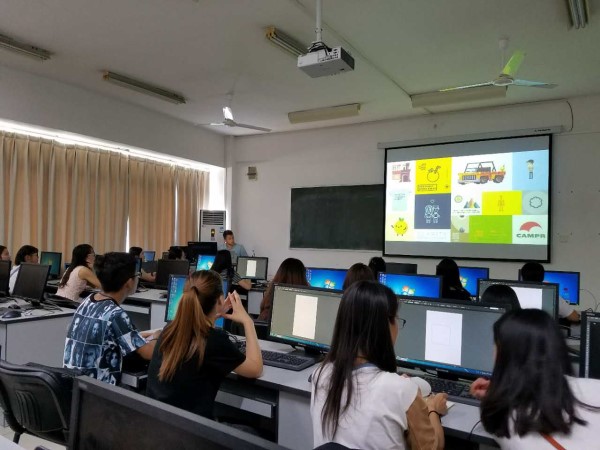 【本网讯】7月13日上午,文化艺术学院特邀的来自美国爱荷华大学的Riley Vier教授正式为学院视觉传达设计专业学生开展课程项目授课。该课程项目致力于学生能够利用Illustrator软件完成高质量的海报设计。课程分为外国专家课堂讲解专业设计知识、指导学生实验操作绘图软件,以及户外实践考察三部分。