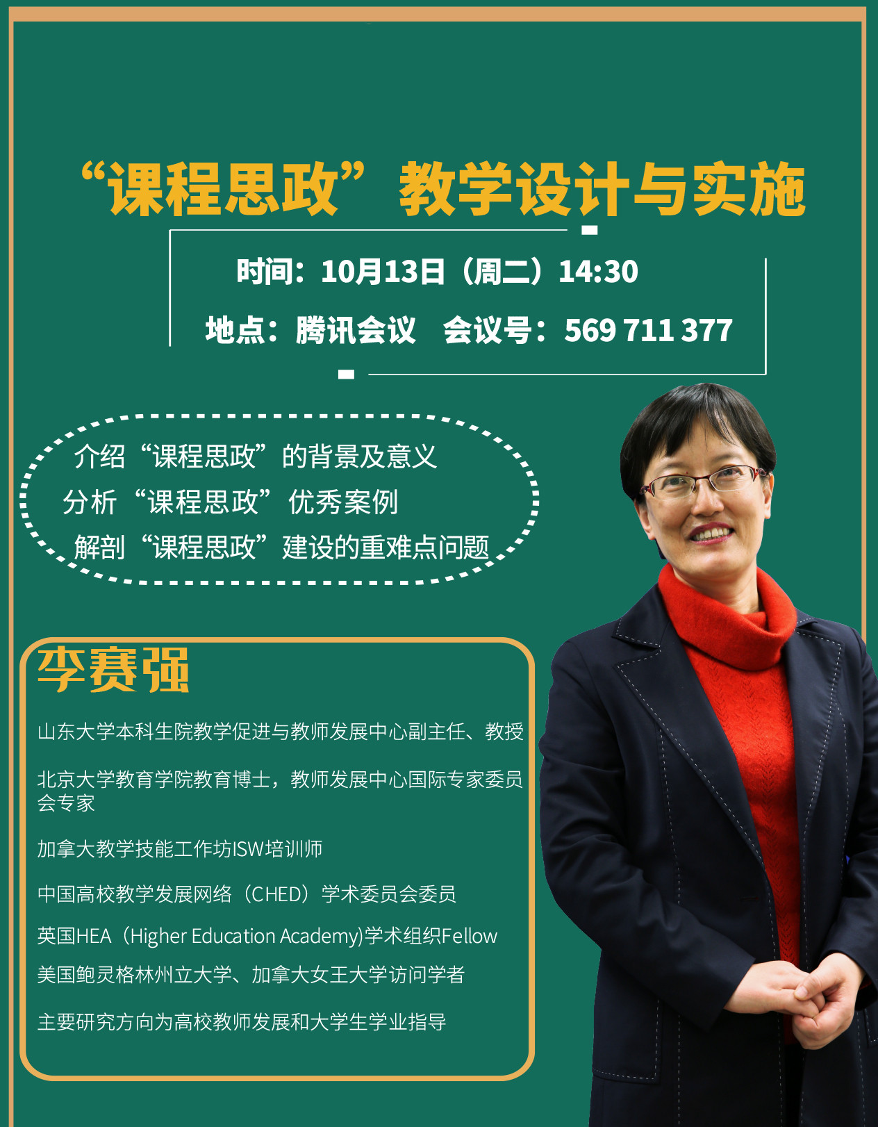 李赛强,山东大学本科生院教学促进与教师发展中心副主任,教授。北京大学教育学院教育博士,北京大学教师教学发展中心国际专家委员会专家。中国高校教学发展网络(CHED)学术委员会委员,加拿大教学技能工作坊ISW培训师,英国HEA(Higher Education Academy)学术组织Fellow