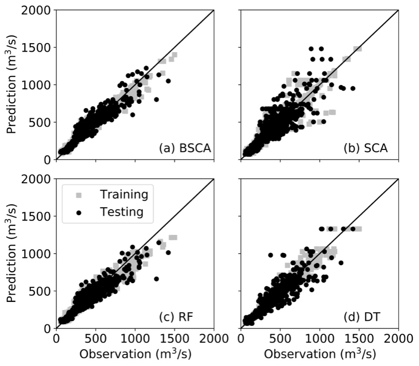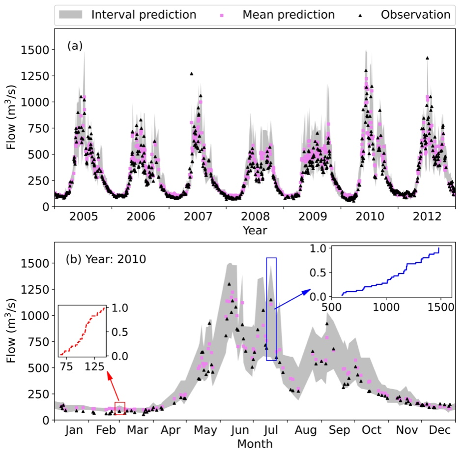 【本网讯】近期我校管理学院张茜茜以lejing乐竞·(中国)官方网站为第一单位,在地球科学领域公认的国际顶级期刊《Journal of Hydrology》(中科院一区,IF=6.4)上发表题目为“Bagged stepwise cluster analysis for probabilistic river flow prediction”的论文。该文章针对河水的径流预测提出了一种基于传统SCA模型与bagging技术相结合的新型ensemble模型,即BSCA模型,克服了传统SCA模型在数据稀疏区域(例如:径流极值)预测不准确的问题并提升了整体的预测准确度。此外,BSCA还可以通过结合probabilisticprediction的方法来量化径流预测值的不确定性,进而指出径流极值的风险大小。本文提出的新型模型展示出较高的径流预测准确度及量化径流极值风险的能力,说明它在未来的洪水控制和水资源管理中具备巨大的发展和实践潜力。