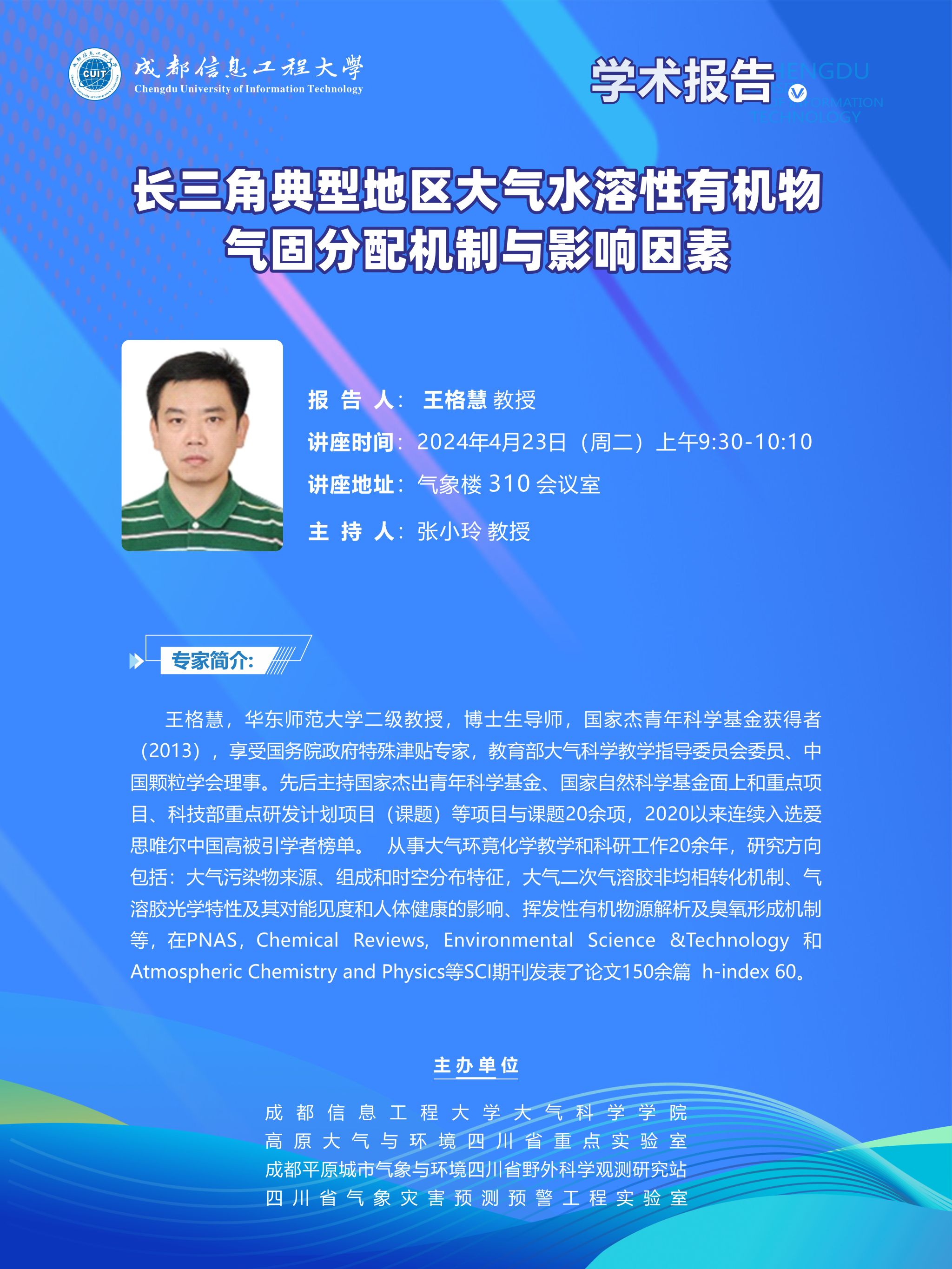 【学术报告预告】长三角典型地区大气水溶性有机物气固分配机制与影响因素