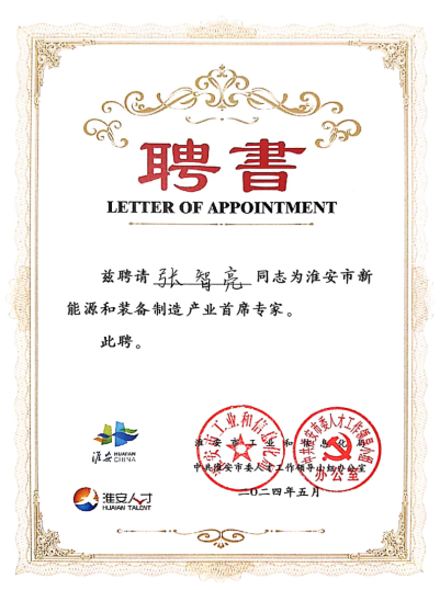 我校自动化学院张智亮教授受聘为江苏省淮安市新能源和装备产业首席专家