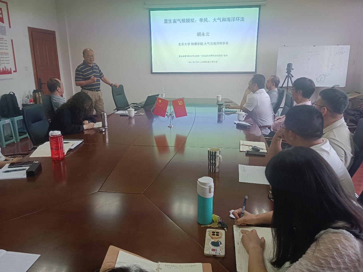 【本网讯】5月28日上午,北京大学博雅特聘教授、海洋研究院院长胡永云在气象楼310会议室,作题为《显生宙气候模拟研究:季风、大气和海洋环流》的学术报告。本次报告由大气科学学院院长张宇教授主持,副院长华维教授、李国平教授、文军教授等部分师生参加了现场报告和学术交流。
