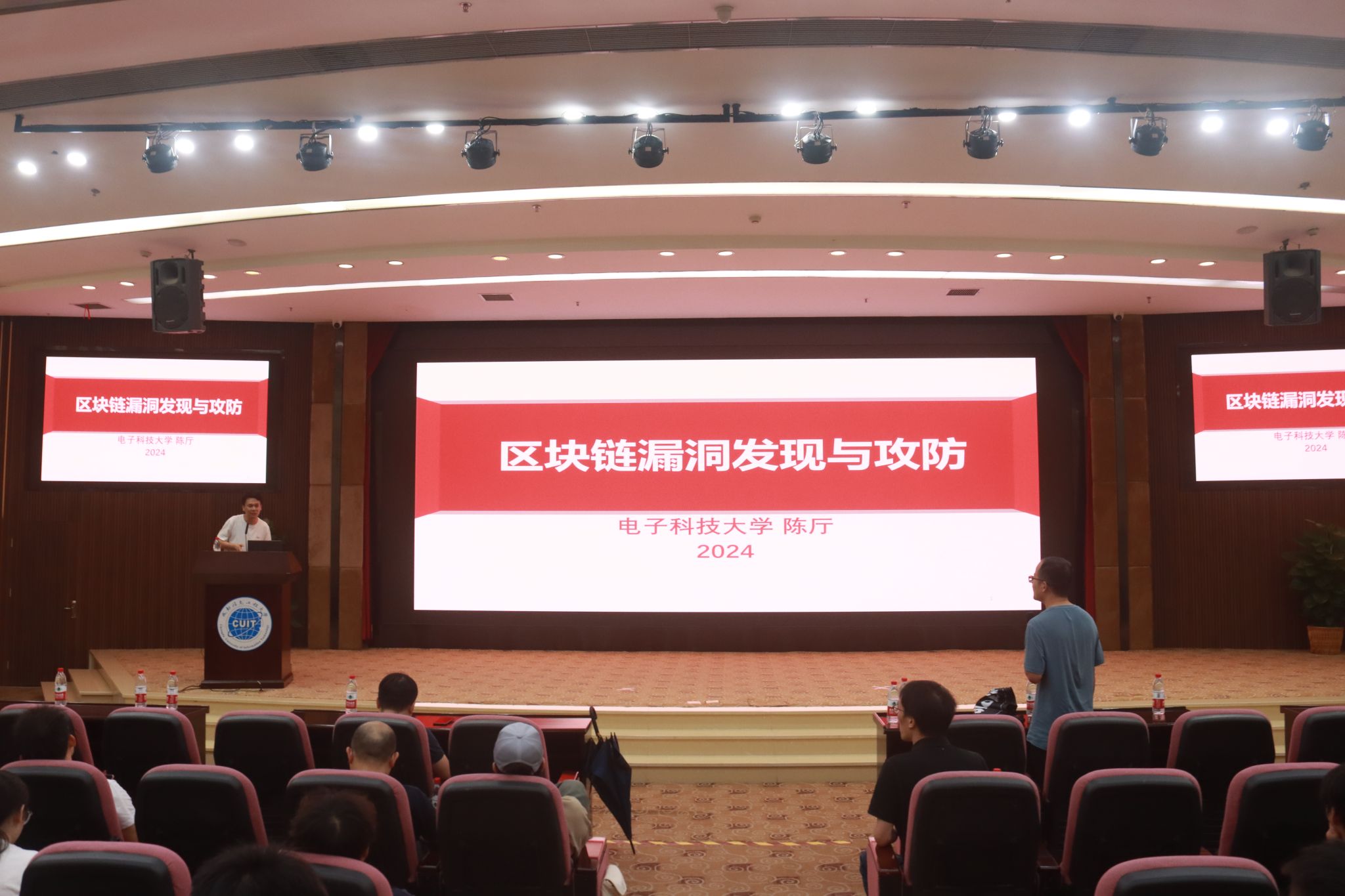 【本网讯】6月3日晚,电子科技大学计算机学院教授、博士生导师陈厅应邀在我校航空港校区国际会议厅作了题为《区块链漏洞发现与攻防》的精彩学术报告,区块链产业学院部分教师、全体研究生及2022级、2023级本科生共200多人聆听此次报告。报告由学院党委书记林细俤主持。