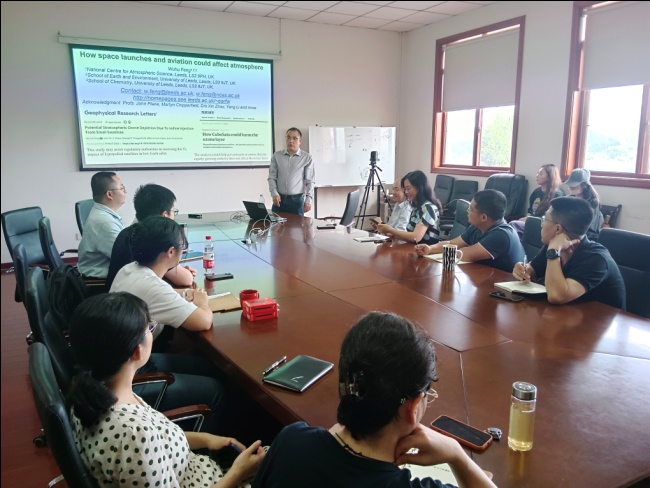 【本网讯】6月27日下午,英国利兹大学国家大气科学中心冯伍虎研究员在气象楼310会议室,作题为《太空发射及飞机排放对大气臭氧层影响》的前沿热点学术报告。本次报告由大气科学学院副院长华维教授主持,院长张宇教授,张小玲教授、宋敏红副教授、周欣副教授、李扬副教授等部分师生参加了现场报告和学术交流。