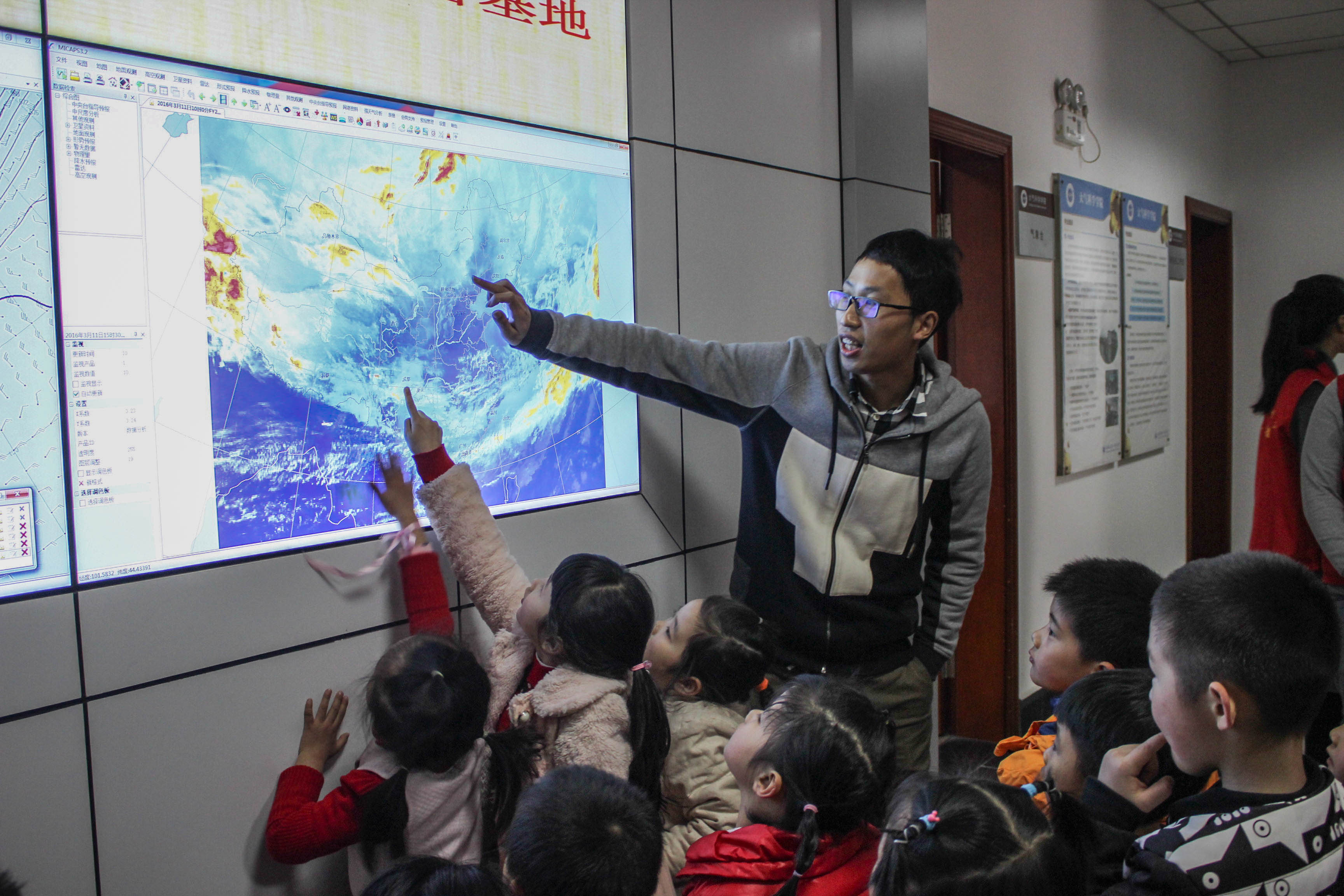 【本网讯】 3.23世界气象日系列活动之“青春成信,多彩大气”成功举办,此次活动由大气科学学院主办。大气科学学院青年志愿者协会的志愿者带领译华幼儿园的二十名小朋友参观了我校气象科普基地。