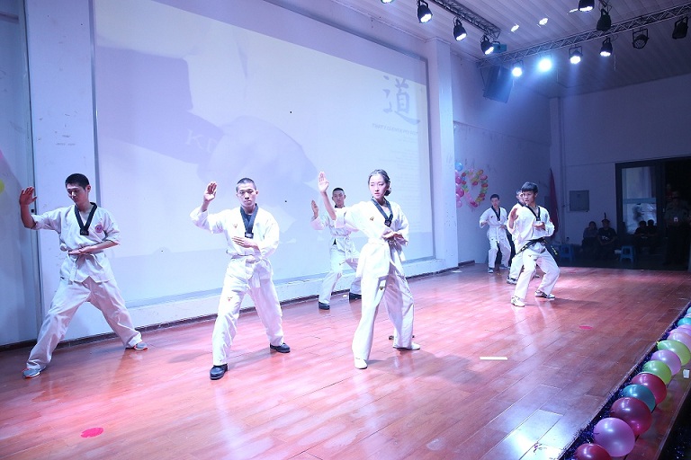 第二篇章——绽放:视频《绽放》通过展示同学们参加各项活动的照片体现他们在大学里面的拼搏和努力;诗朗诵《致老师》朗诵者用深情的话语表达了所有大一同学想要对老师们说的话,“谢谢您!老师!”;随后由教师代表徐志华老师和刘志红老师上台致辞,表达了自己的感受,也激励同学们继续努力,更好地绽放自己;综合武术表演《棍武行天下》用劲爆的跆拳道表演和双截棍表演调动起全场观众的气氛,利落的动作和孔武有力的品势表演展现着当代青年特有的热血与激情。