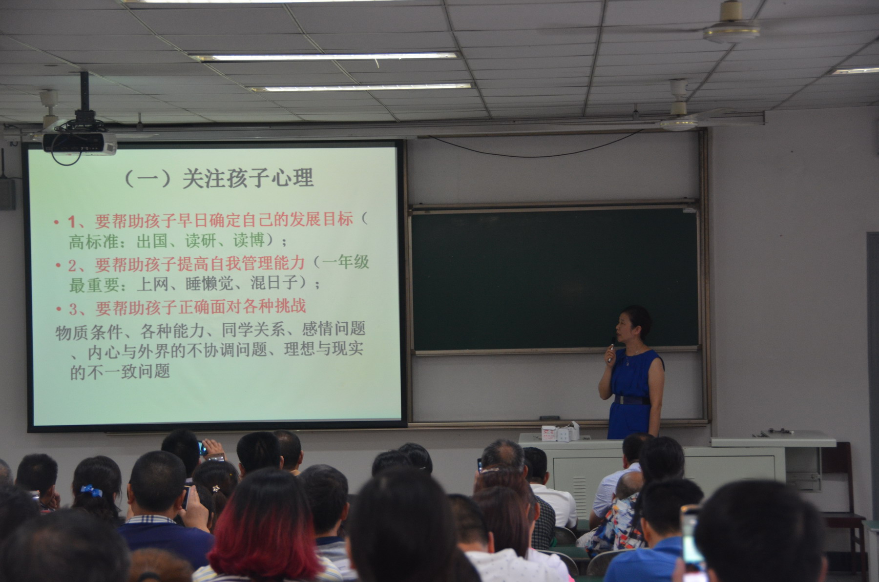 邓书记从大学生活、学院的学生工作、学生发展状况、家庭对学生成长的影响、转专业、学习和纪律处分等七大方面详细的介绍了学院的规章制度以及学生在校四年可能会遇到的情况。重点分析了大学生活因人而异的两大原因——厌学和不适应大学生活,以此来告诫家长在注重孩子学习的同时也要关注孩子的身心健康。并希望家长能够多和孩子沟通,保持和辅导员、学校的联络,帮助学生迅速融入大学生活中。