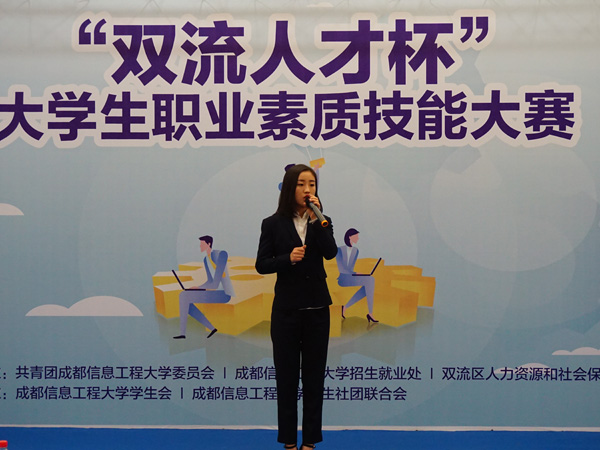 12月13日晚19:00,由校团委、招就处、双流区人力资源和社会保障局、双流人才网主办,我校学生会、学生社团联合会承办的 “双流人才杯”大学生职业素质技能大赛决赛在国际会议厅隆重举行。成都市双流区就业服务管理局主任凡鸣全、北京北森测评技术有限公司总监杨军、成都美佳科技有限公司人事经理杨静、校团委副书记厉威成、政治学院江俊文老师出席比赛并担任评委。300名师生到现场观摩了比赛。