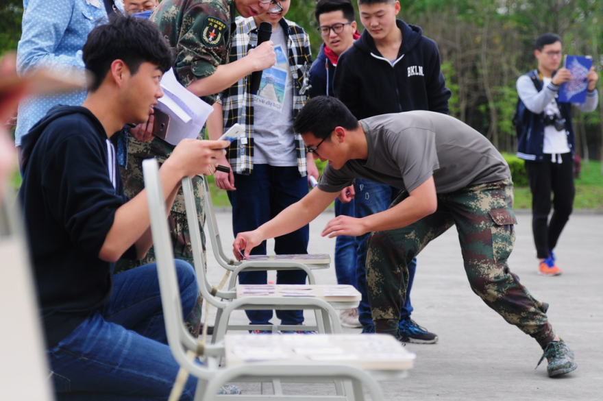 在王燕的带领、国防生学生党支部的组织下,同学们展开了“你画我猜”、“气球接力”、“扑克短跑”、“拔河比赛”等一系列拓展活动。赛前主持人宣布规则并组织志愿者进行演示。活动井然有序进行,同学们保持着高度的热情积极参与其中,团队合作、争优创先意识体现的淋漓尽致。