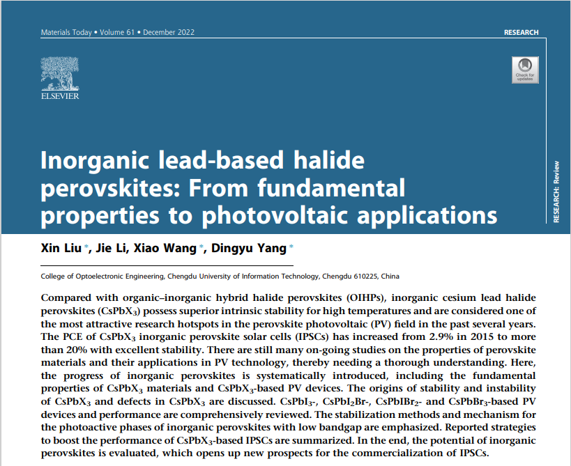 获批“高性能光电探测材料与集成器件”四川省科技创新群体1项,为学院获批的首个省部级科研团队;学院今年以第一单位发表SCI论文32篇(一区:3,二区:12,三区:10,四区:10)。其中,学院新能源团队刘欣博士在《Materials Today》(1区TOP,IF = 26.94)发表的论文“Inorganic lead-based halide perovskites: From fundamental properties to photovoltaic applications”,影响因子为学院历史最高,表明学院基础研究能力取得重要进展;学院作为牵头单位获2022年四川省科技进步二等奖1项,科研奖项实现历史性突破。
