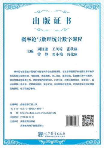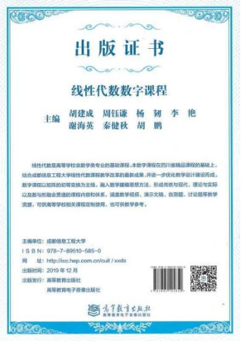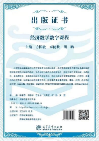出版数字课程3门,分别为《线性代数》,《概率论与数理统计》和《经济数学》。相关出版证书见图11。