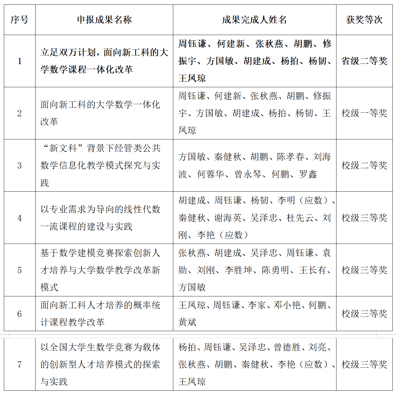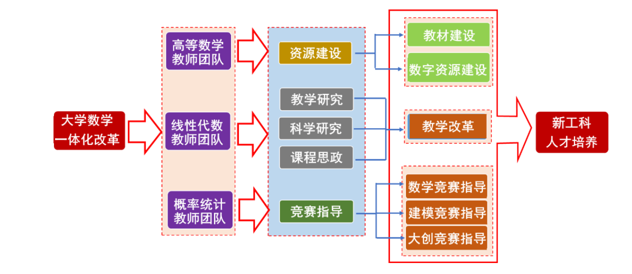 为进一步提升公共课程教育教学的效果,为学校人才培养提供有效地支撑,应用数学学院近年来深入钻研、科学规划,扎实推动教学改革。依托国家一流专业建设点和省级一流课程,基于教育部高等教育司项目、高等学校大学数学研究与发展中心项目、四川省教育厅重点项目和学校项目的研究,以价值塑造为引领,数学知识与工程应用交融为抓手,新工科能力培养为核心,创新思维培养为主导,全面开展教师队伍、教学资源、教学体系、实践环节的一体化改革,解决了新工科背景下大学数学课程存在的诸多问题,取得如下成果: