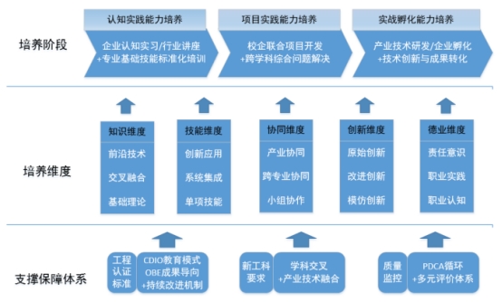 学校聚焦电子信息等产业链,深化政产学研全方位合作,实施产教融合校企合作协同育人,建立多元协同培养机制。开展大气英才班、中电熊猫班等定制班、实验班进行分类培养。打造网信人才培养基地,人工智能产教融合创新基地和3个新型现代产业学院,确立了产教融合协同育人的成信模式。两次获批四川省产教深度融合改革试点项目,首批项目以“优秀”且排名第一顺利通过验收。近五年共获得产教融合相关经费2.26亿元,获批教育部产学合作协同育人项目265项,新增200余个产教融合实习实训基地。