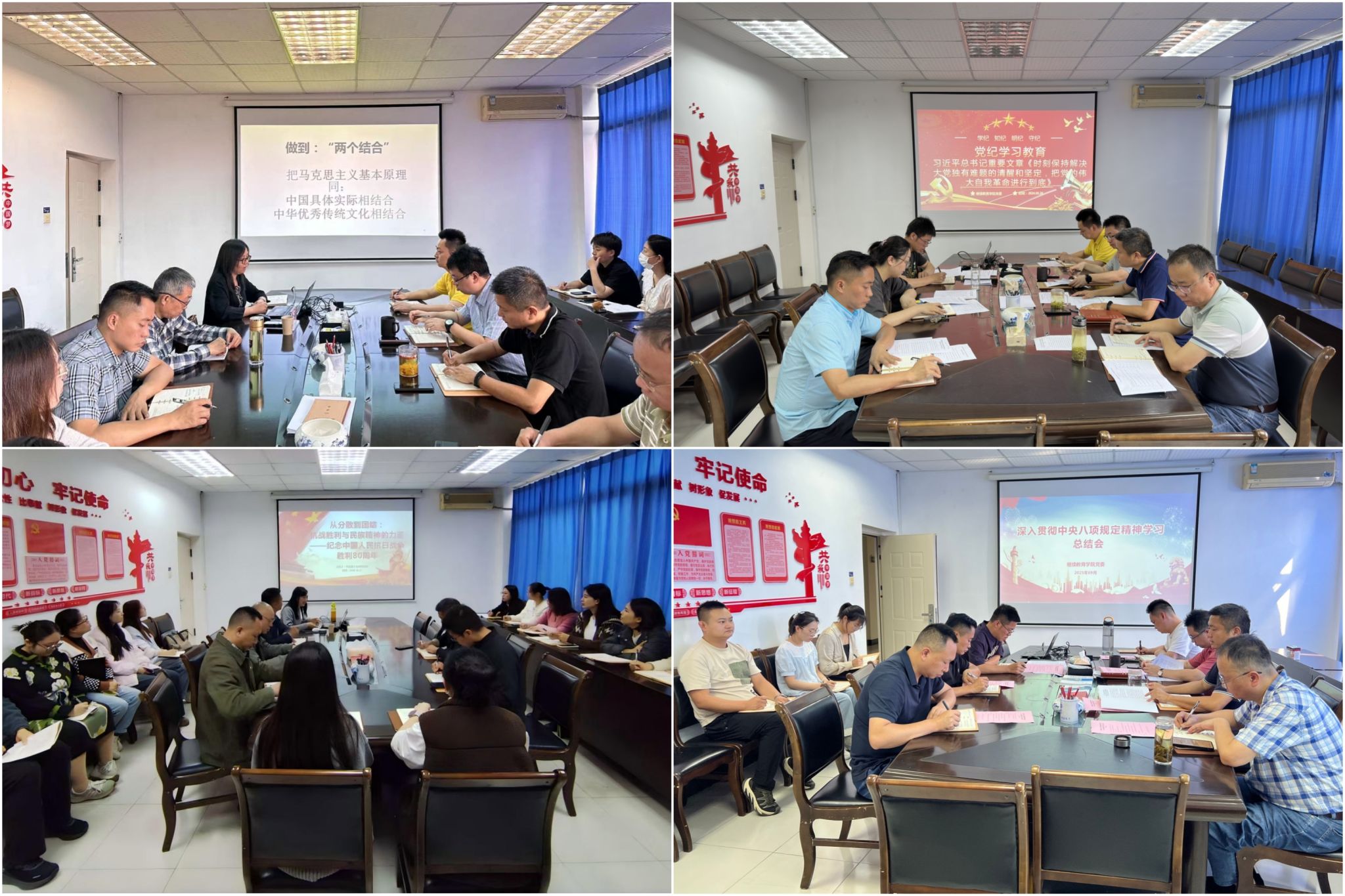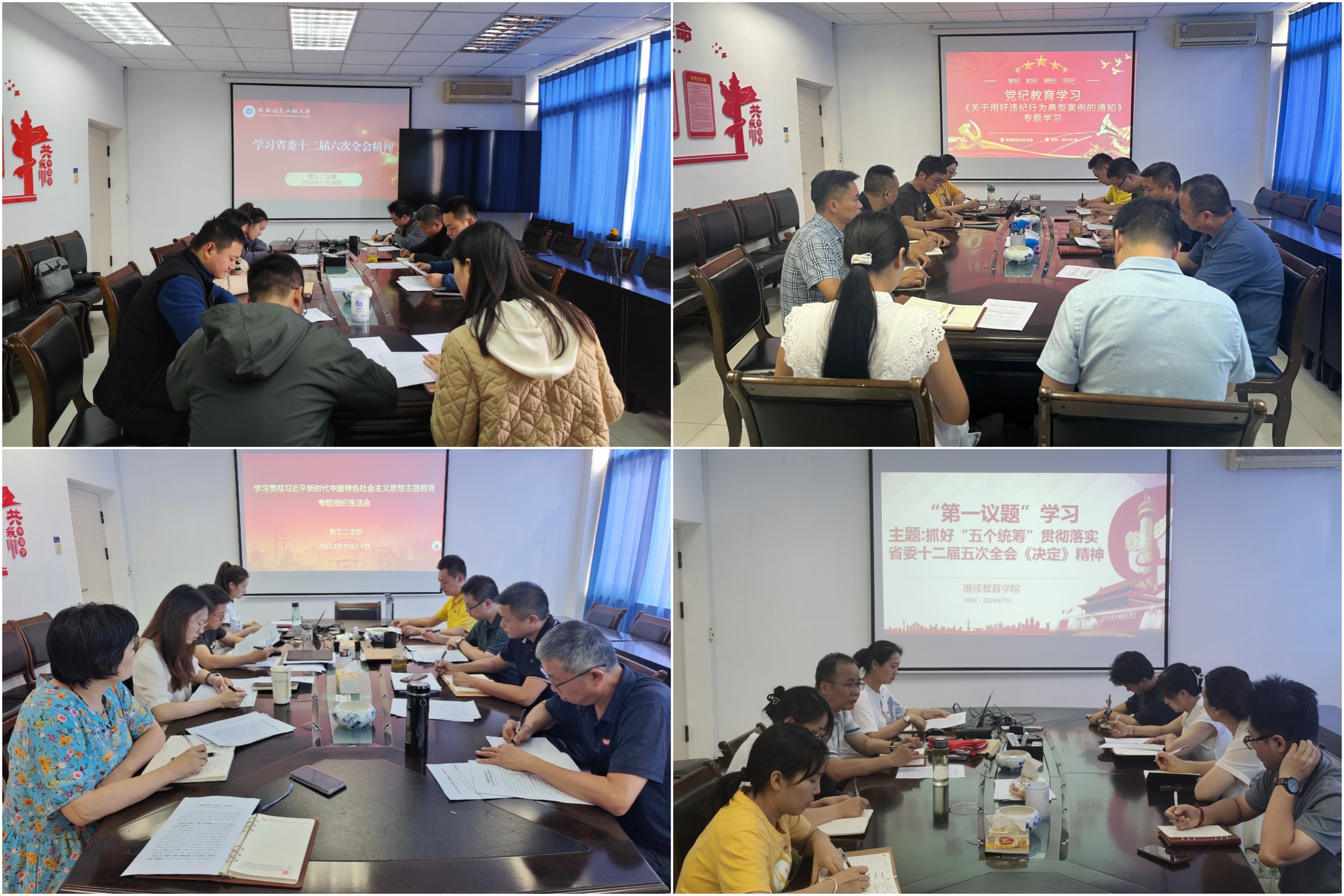 落实第一议题制度。自2024年开展“第一议题”制度以来,构建了“领学+研讨+实践”三位一体学习机制。在党委会、党政联席会、基层党组织大会等重要会议中,党委书记带头领学习近平新时代中国特色社会主义思想,深度解读上级主管部门最新政策文件。通过专题研学、案例剖析、互动交流等形式开展“第一议题”学习20余次,引导党员干部学深悟透理论精髓,精准把握政策导向,对新时代继续教育的使命任务、发展路径有了更深刻的认识。