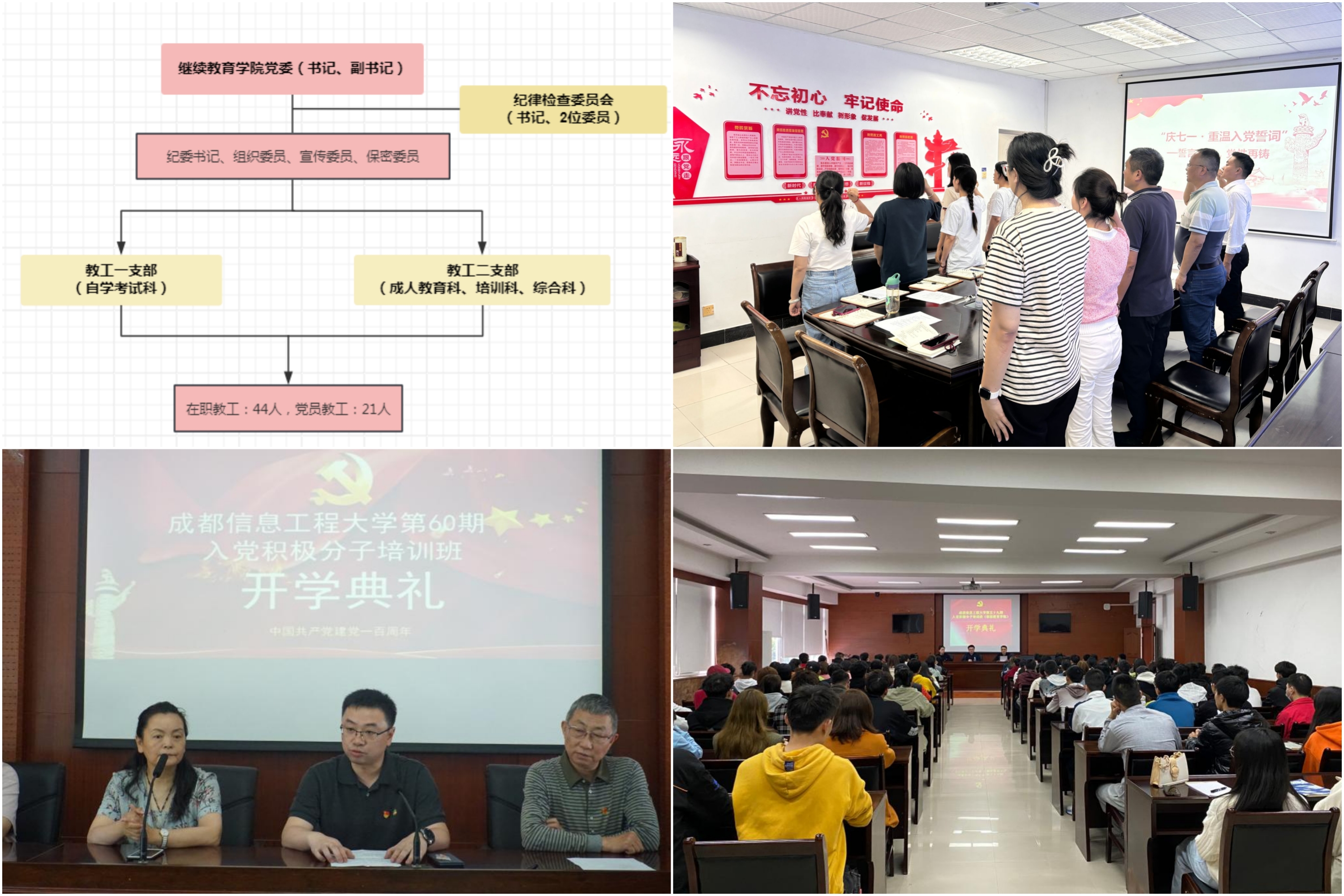 完成党委及党支部换届。继续教育学院严格遵循党内选举制度与程序,有序推进党委及党支部换届工作,为强化党组织核心领导力、夯实组织建设根基提供关键支撑。期间,学院成功选举成立第一届继续教育学院党委,通过规范的民主选举流程产生新的党委成员,构建起结构合理、素质过硬的党委领导班子。