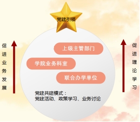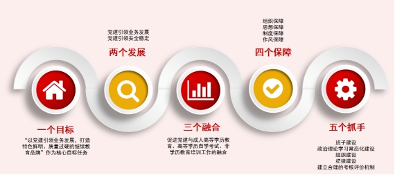 建设“12345”党建工作品牌。明确一个目标任务,推动两个发展,夯实党建基础。班子成员认真履行党建工作“一岗双责”。根据学院的发展规模和工作需要,合理调整党支部设置,确保党的引领覆盖到学院的各个部门和业务领域。落实党建引领业务发展的目标任务。以党建发展引领高等学历继续教育、高等学历自学考试、非学历教育的协同发展,引领学生安全稳定,加强党风廉政建设发展。